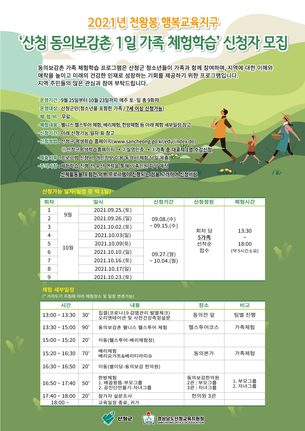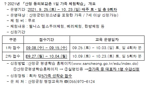 안녕하십니까? 천왕봉 행복교육지구와 연계하여 산청군청에서 진행하는「산청 동의보감촌 가족 체험학습」을